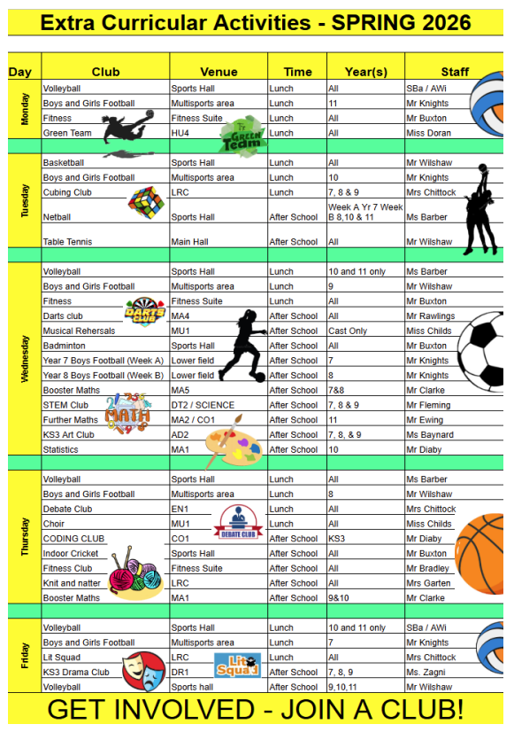 Below is a list of all the extra-curricular activities our staff are volunteering to offer at lunch times and after school.  You will see that there is a wide selection of activities throughout the week, and we hope many students will take up the opportunities available to them.  Please be aware of the following points: